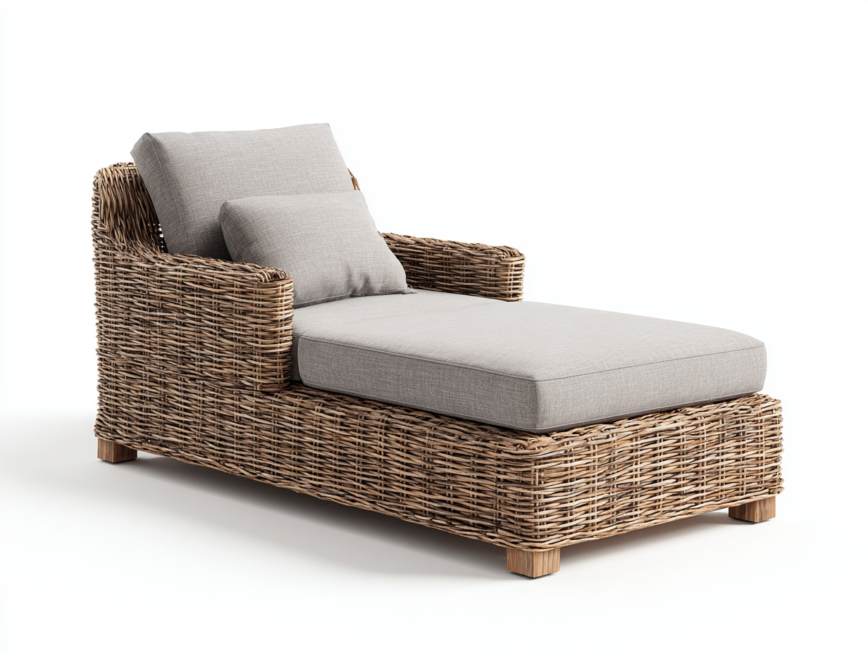 Die Konstruktion besteht aus Rattan in Kombination mit Holz und sorgt für Stabilität sowie eine natürliche Optik. Die Oberfläche ist in Natur gehalten und die Liegefläche mit Stoff in Beige bezogen. Die Verarbeitung ist gleichmäßig und für eine zuverlässige Nutzung im Außenbereich geeignet.